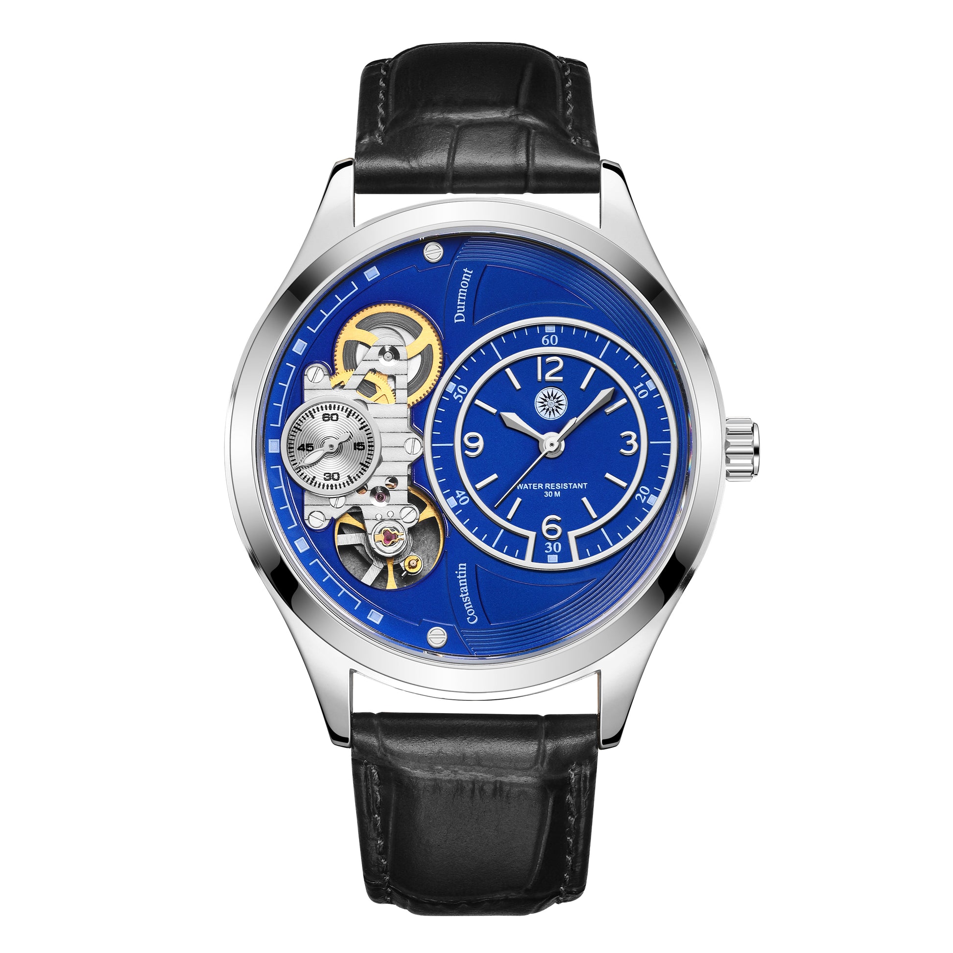 Die Constantin Durmont Tourvère Bleu Acier ist ein moderner Herren-Zeitmesser mit sportlich-eleganter Ausstrahlung. Das tiefblaue Zifferblatt in Kombination mit sichtbaren Elementen verleiht der Uhr eine präzise Optik. Polierte Metallflächen, klar strukturierte Anzeigen und das schwarze Lederarmband unterstreichen den hochwertigen Charakter dieses Modells – geeignet für Alltag, Business und besondere Anlässe.