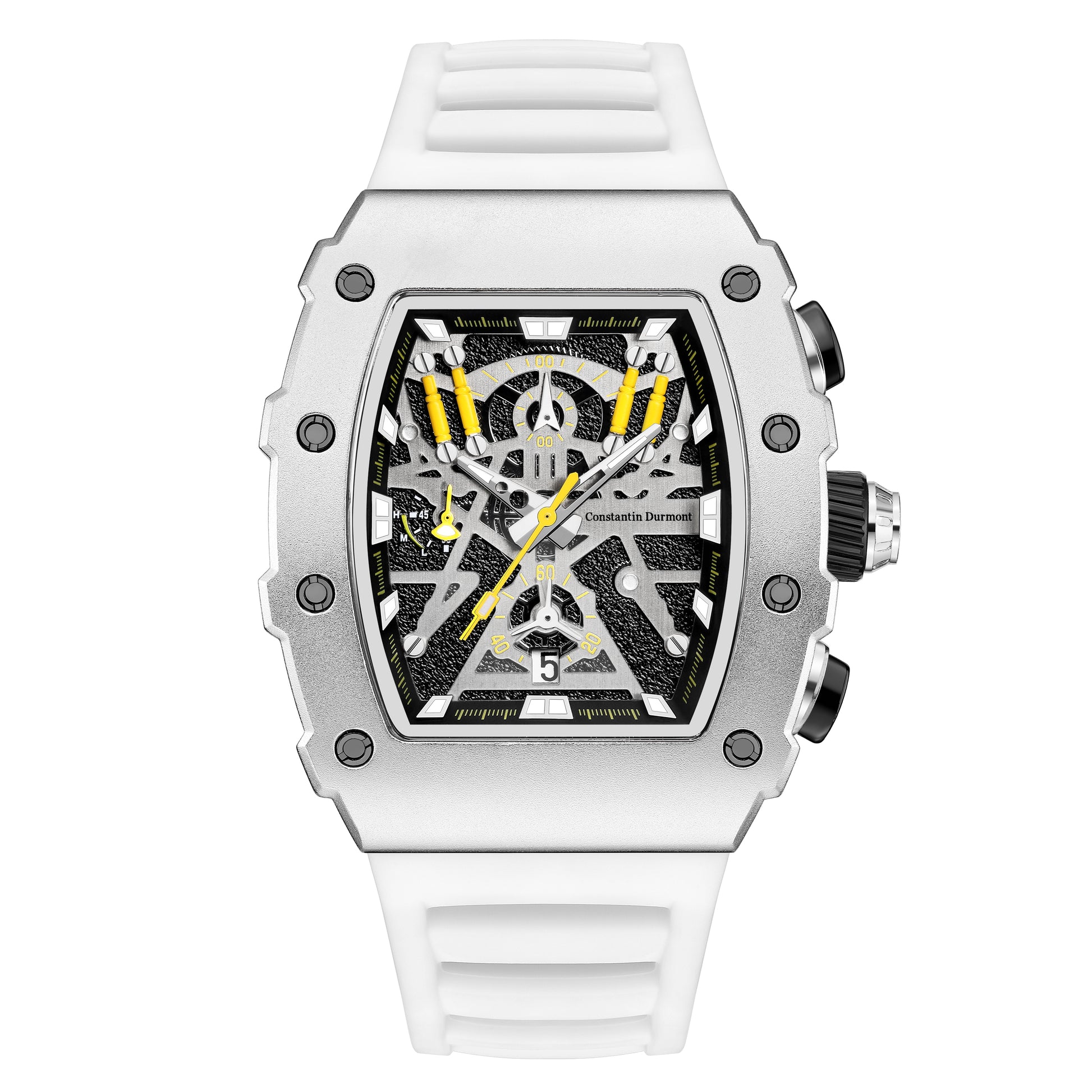 Der Constantin Durmont Altéragarde Blanc ist ein moderner Herren-Chronograph mit kraftvollem Design und markanter Tonneau-Gehäuseform. Das teilskelettierte Zifferblatt mit dunkler Struktur, silberfarbenen Brückenelementen und gelben Akzenten sorgt für eine dynamische Optik. In Kombination mit dem weißen Sportarmband entsteht ein ausdrucksstarker Zeitmesser für Alltag, Freizeit und besondere Anlässe.