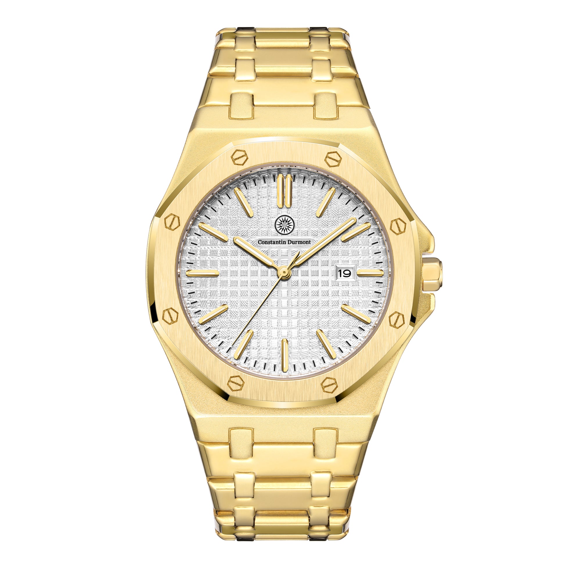 Die Constantin Durmont Montédur Blanc Doré ist eine sportlich-elegante Armbanduhr mit markanter Gehäuseform und einer besonders klaren Ausstrahlung. Das helle, weiß strukturierte Zifferblatt sorgt für eine frische Wirkung und bildet einen harmonischen Kontrast zu den goldfarbenen Elementen von Gehäuse, Zeigern und Indizes. In Kombination mit dem kantigen Metallgehäuse und dem integrierten Metallarmband entsteht ein zeitloses Design, das sich vielseitig kombinieren lässt – von Business bis Freizeit.